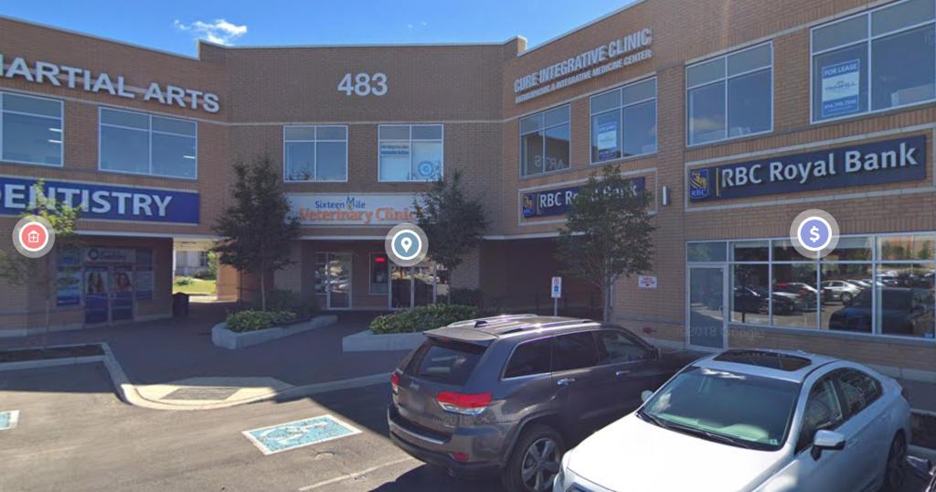 Free parking in the public parking place in front of RBC branch, step into the building through the door in the corner (the center in the above picture);